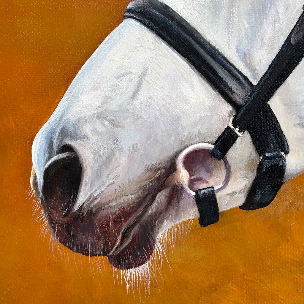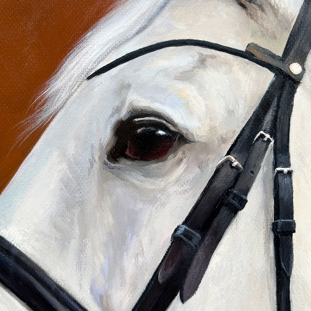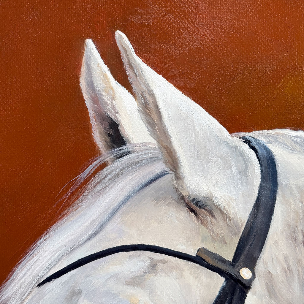 Центральным элементом композиции стала величественная голова лошади в элегантной чёрной упряжи. Взгляд животного — глубокий, спокойный, полный достоинства — словно приглашает зрителя в мир её мыслей. Чистота белоснежной шерсти контрастирует с насыщенным терракотово-оранжевым фоном, создавая эффектный драматизм и подчёркивая аристократизм героини портрета.